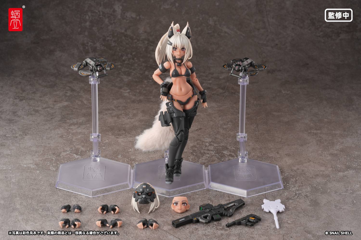 - Includes the primary weapon "KITUNEBI Mk.1" and the secondary weapon "KITUNEBUKU Mk.1." The weapons themselves are painted in detail, and even the bullets loaded in the magazine are carefully painted. The secondary weapon "KITUNEBUKU Mk.1" can be stored in a holster attached to the side of the thigh, which is securely fastened with a magnet.