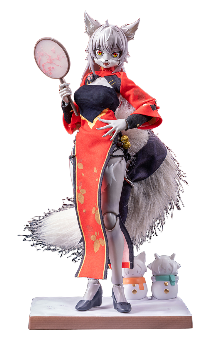 Dressed in a vibrant red cheongsam inspired by the Chinese New Year, Liya radiates celebratory charm and seasonal splendor. She holds a lantern shaped like a fox’s face, creating a captivating and symbolic display piece. Her fluffy tail is crafted from real fur material, adding a soft and realistic texture that enhances the overall presentation. Interchangeable barefoot parts are also included, offering additional display options that highlight her graceful design.